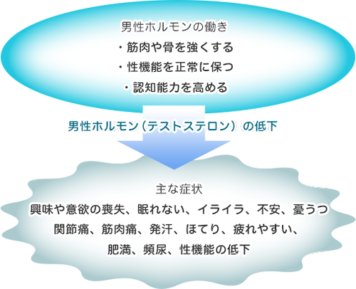 テストステロンはホルモンの1種で、男性的なカラダを作るもととなります。女性のもつテストステロン量は男性の20分の1といわれています。30歳前後から減り始めてしまい、40代以降では男性更年期障害も起こる可能性があります。